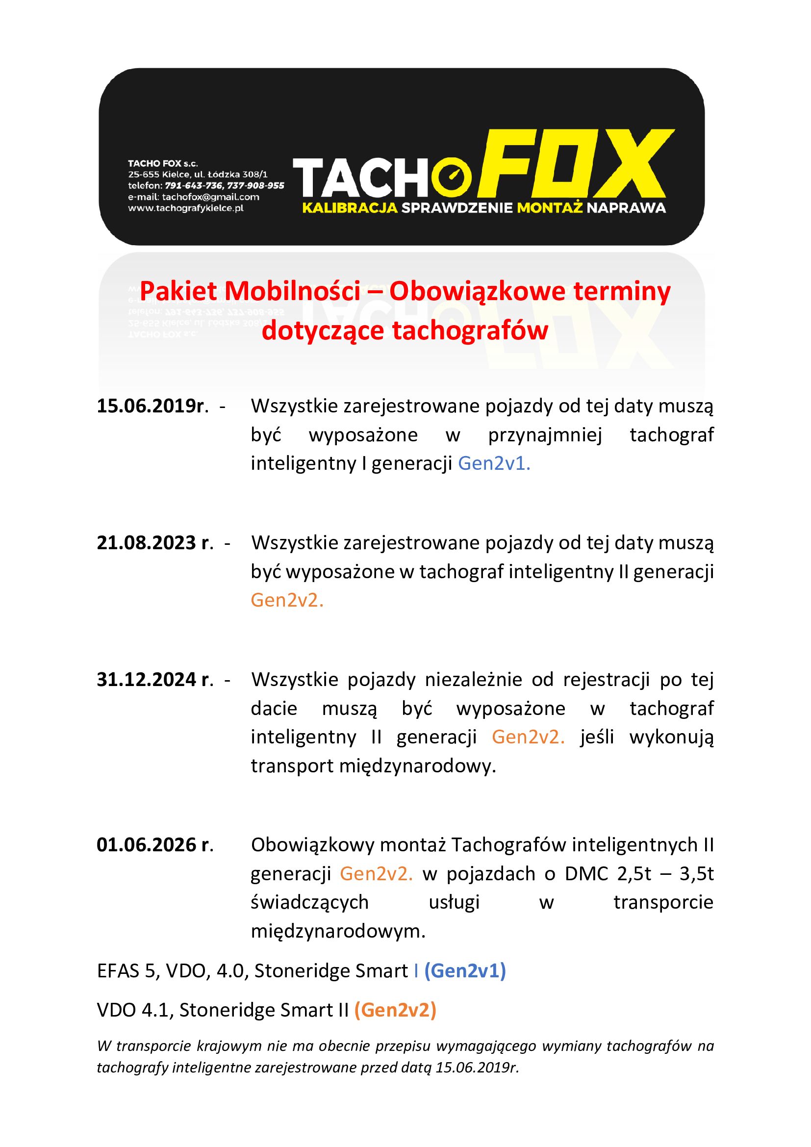 Natomiast po dacie 20.08.2025r. Muszą być wyposażone w tachografy VDO 4.1 lub SE Smart 2